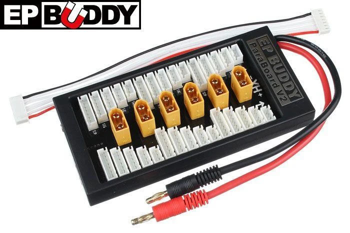 Use ParaBoard V2 to charge up to 6 batteries in parallel. This ParaBoard can be used for batteries with JST-XH type balance plug (the most popular type in the market) and XT60 connectors.