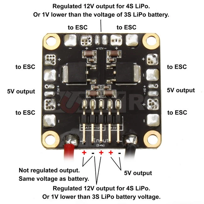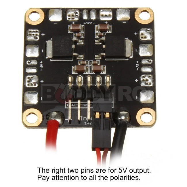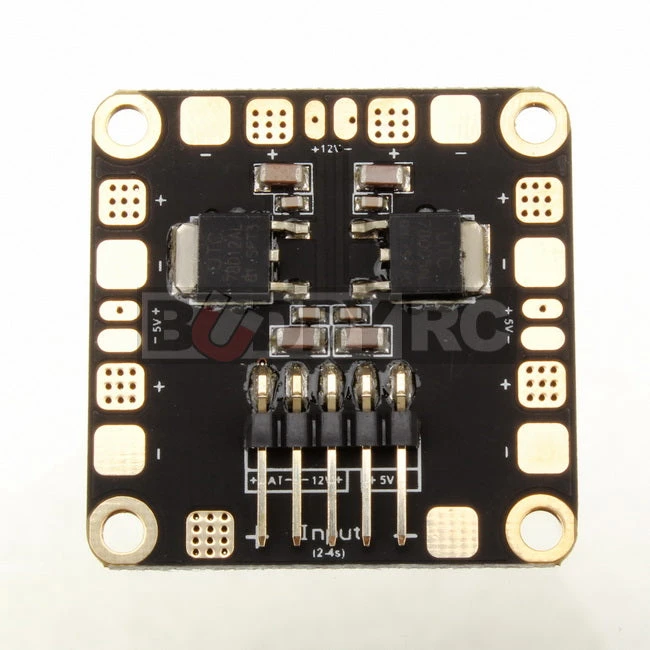 Kensun power distribution board with 12V and 5V output. The board is the same size as popular flight controllers, such as CC3D, Naze32, Rev6, F3, F4, etc.