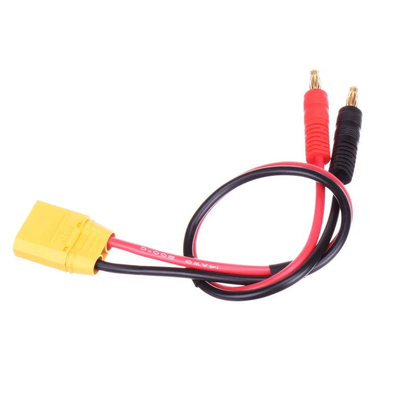Made of genuine XT90 and soft 14 AWG silicone wires, 12″ long. Used for charging batteries with XT90 connectors.